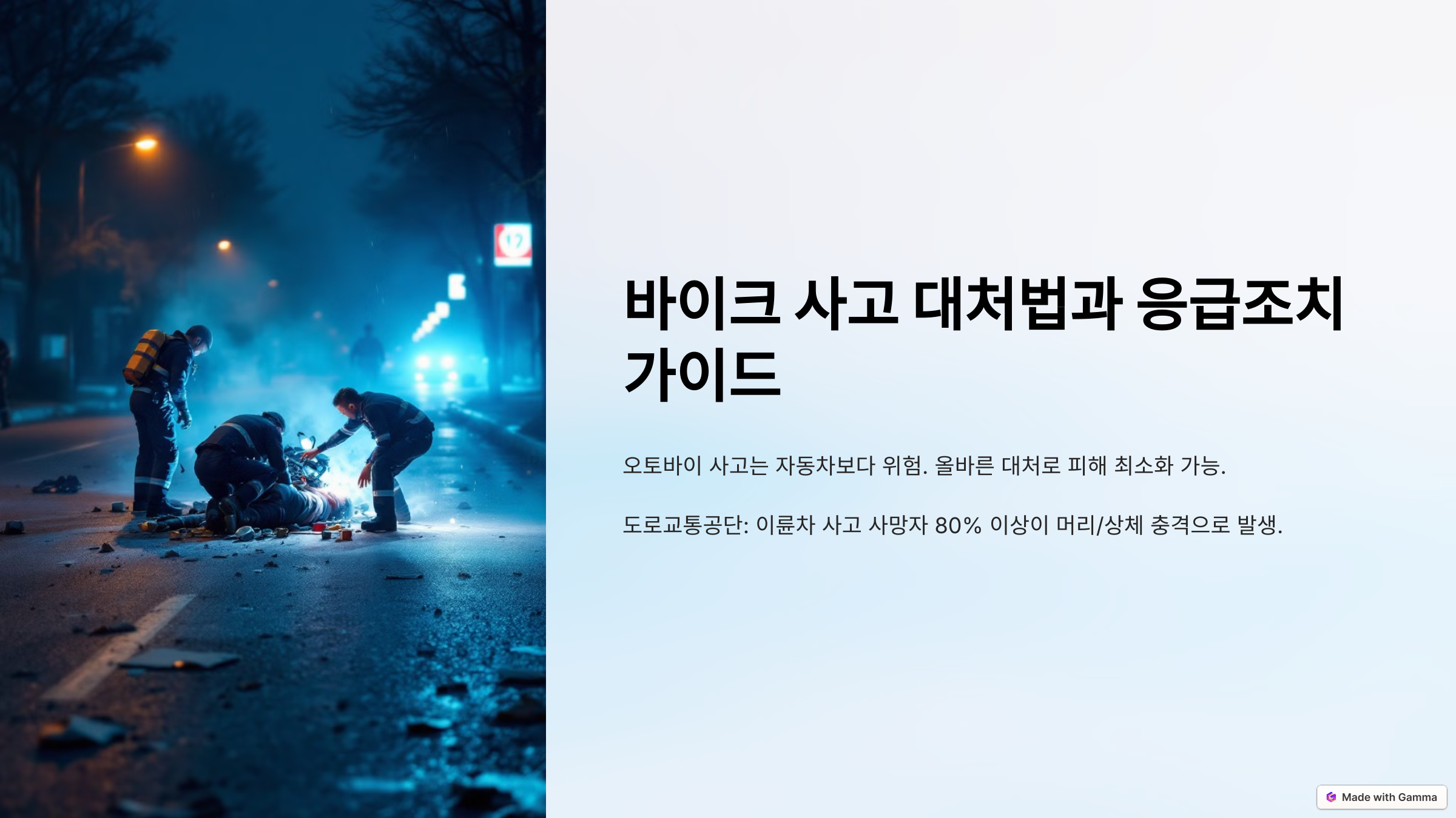 오토바이 사고는 자동차 사고보다 훨씬 위험하다. 운전자가 직접 충격을 받기 때문에 작은 사고라도 큰 부상으로 이어질 가능성이 높다. 하지만 사고 발생 후 어떻게 대처하느냐에 따라 피해를 줄일 수도 있고, 반대로 부주의한 대응이 더 큰 부상을 초래할 수도 있다.