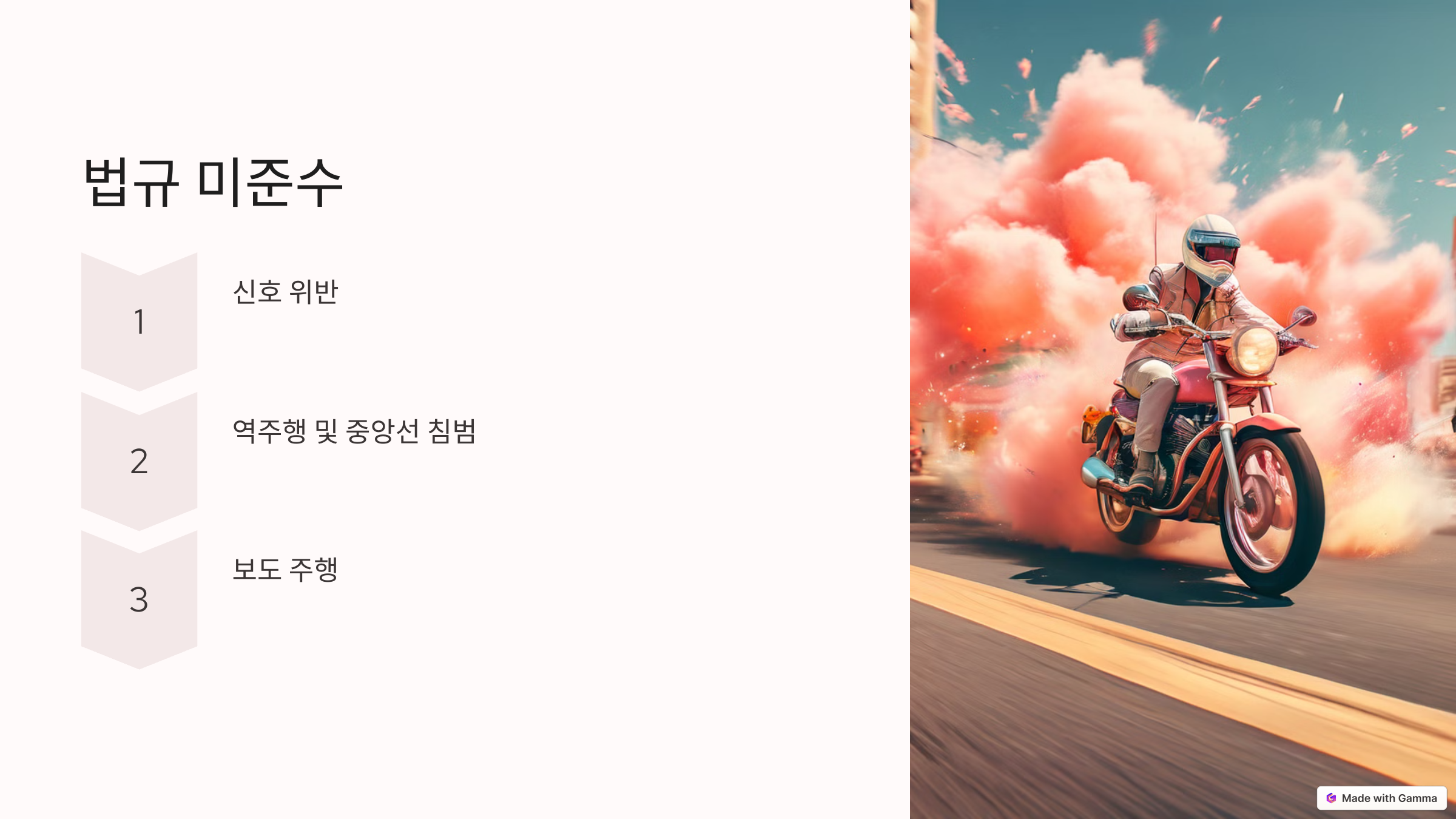 ✔ 이륜차 전용 도로 부족 – 오토바이가 다닐 수 있는 전용 차로가 없어 자동차와 혼재된 환경에서 주행해야 함