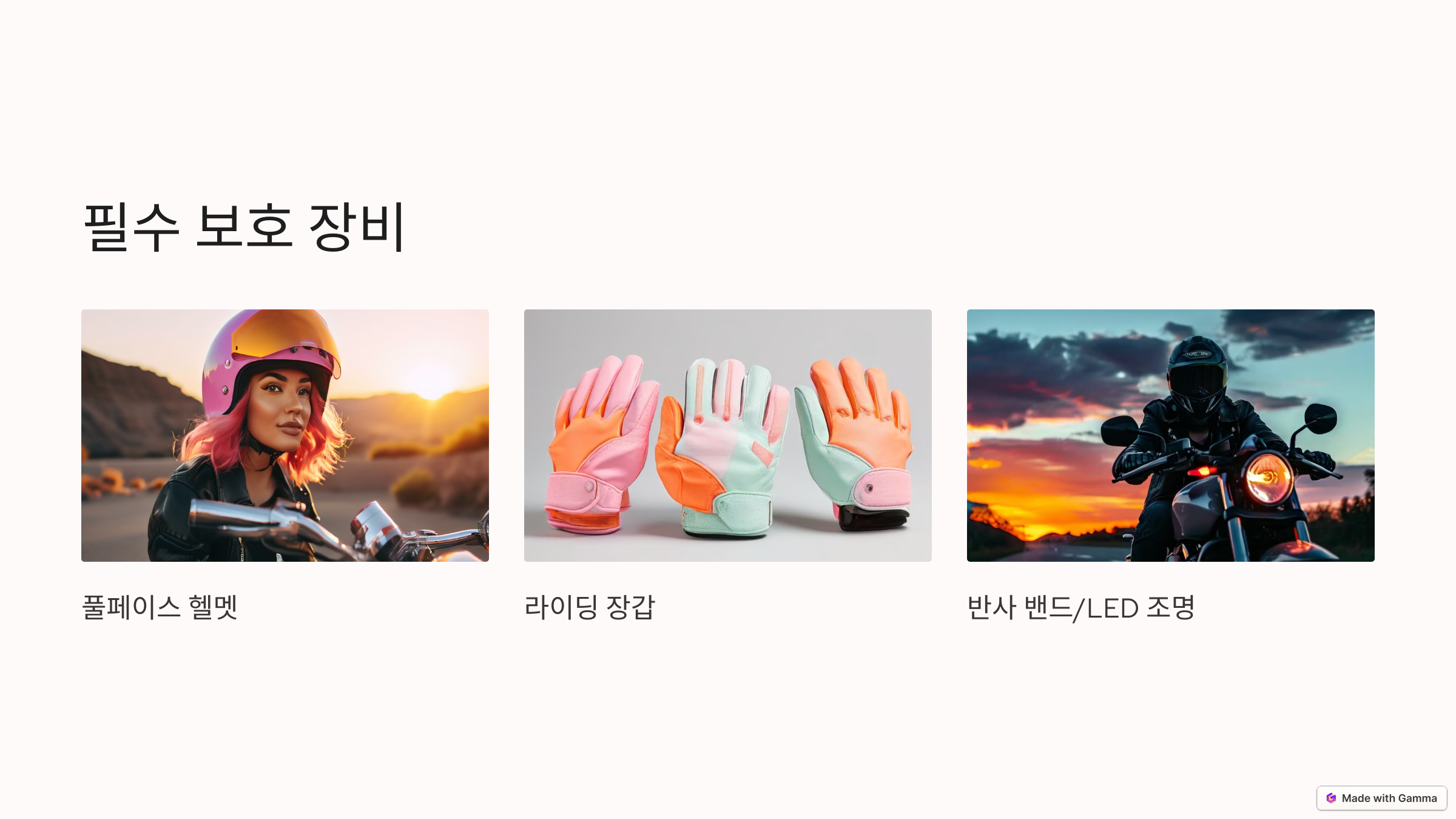 ✅ 보호 장비 착용 – 풀페이스 헬멧, 보호대, 장갑, 반사 밴드는 필수다.