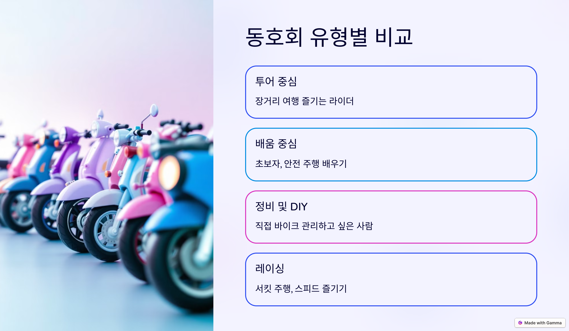 오토바이 동호회는 여러 가지 유형이 있어요. 본인의 스타일과 목적에 맞는 동호회를 찾는 게 중요합니다!