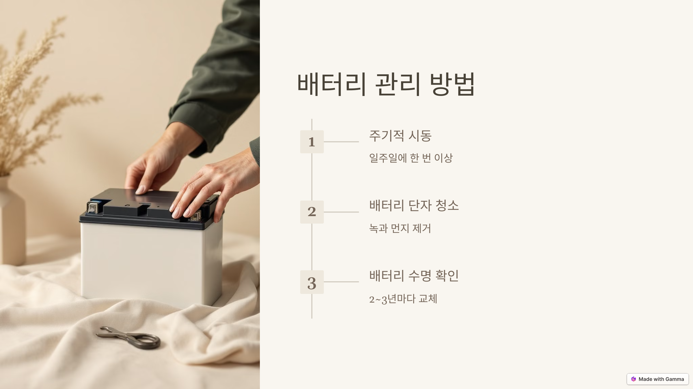 "배터리는 꾸준히 관리하면 오래 사용할 수 있습니다!" 방전되지 않도록 정기적으로 점검하세요.