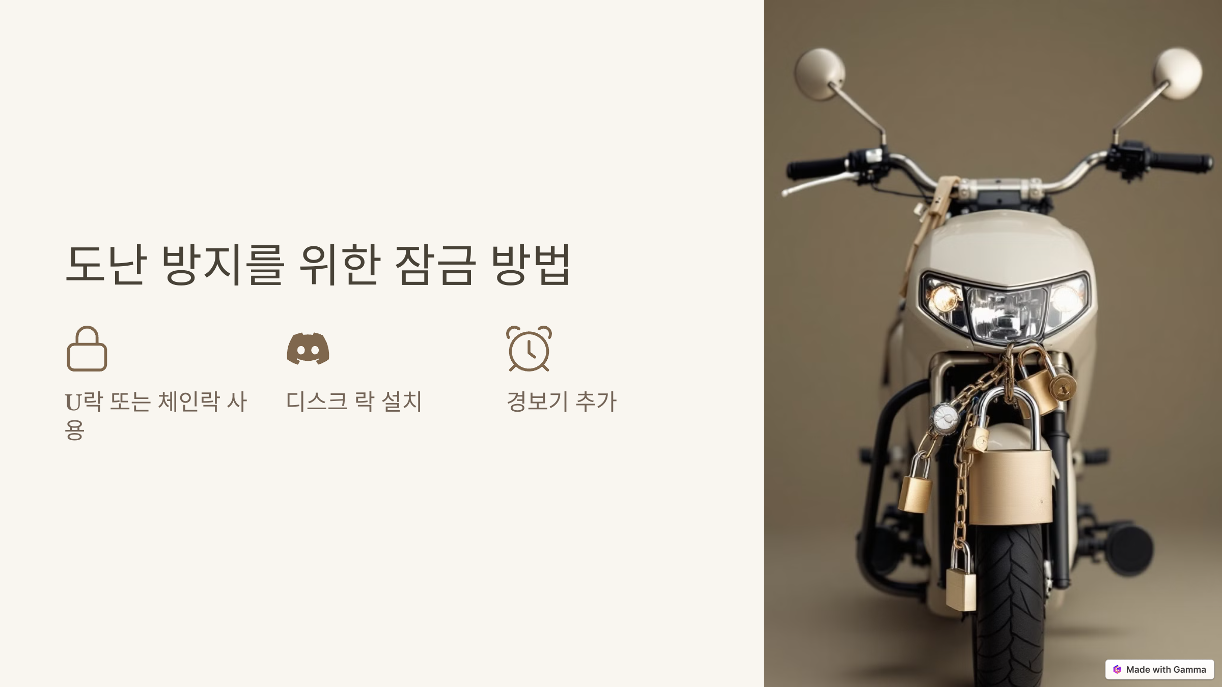 오토바이는 차량보다 가벼워 도난 위험이 높습니다. 초보 라이더라면 오토바이를 안전하게 잠그는 방법을 꼭 알아둬야 해요!