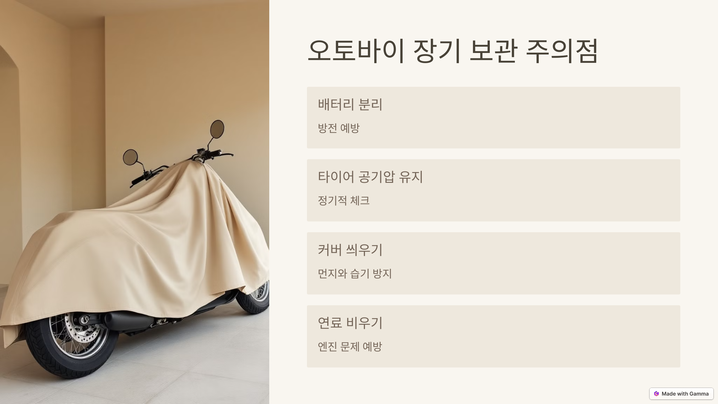 "장기 보관도 제대로 하면 오토바이 수명이 길어집니다!" 관리만 잘해도 다음 라이딩이 훨씬 수월해져요.