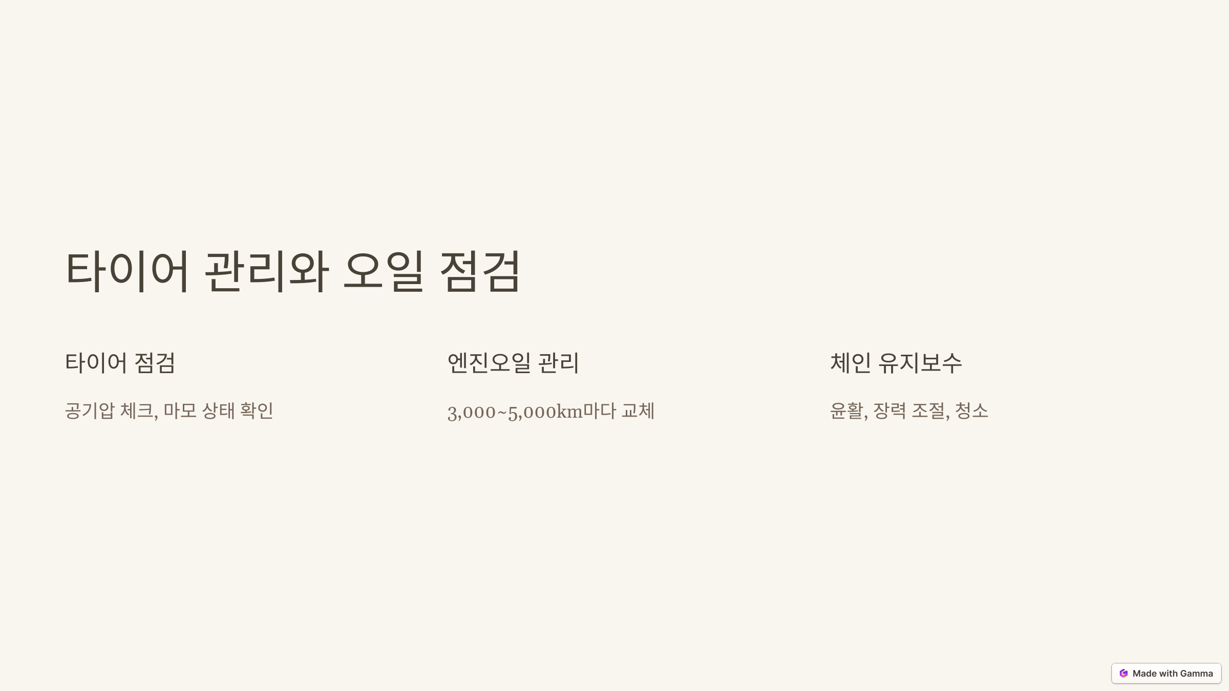 "엔진오일과 체인 관리는 부드러운 주행을 위한 필수 조건!" 정기적으로 점검하고 관리하세요.