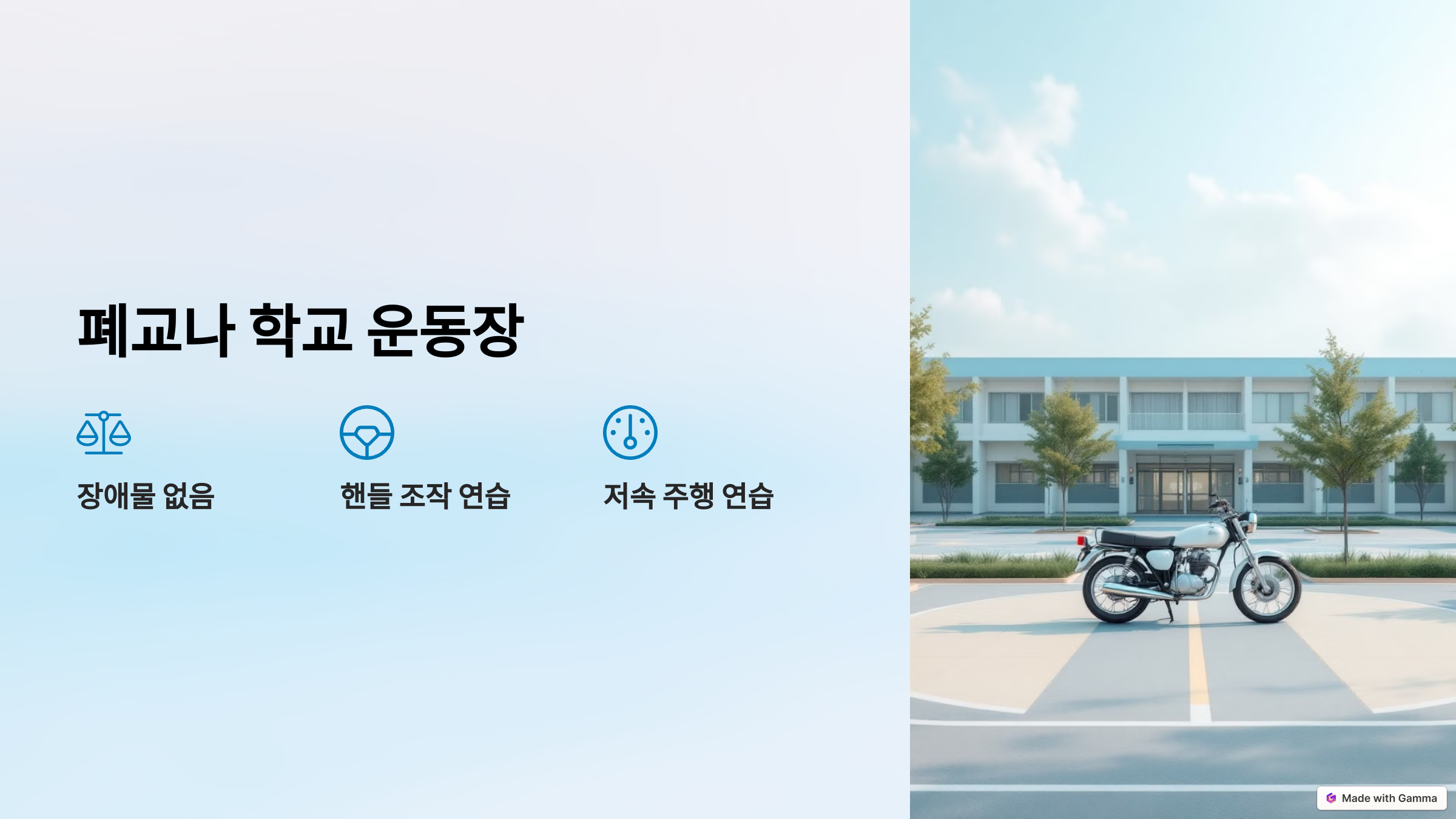 초보 라이더가 오토바이 연습을 하기 가장 좋은 곳 중 하나는 한산한 공영 주차장입니다. 이곳은 넓고 장애물이 적어서 기본적인 균형 잡기, 출발 & 정지, 저속 주행 연습을 하기에 좋아요!