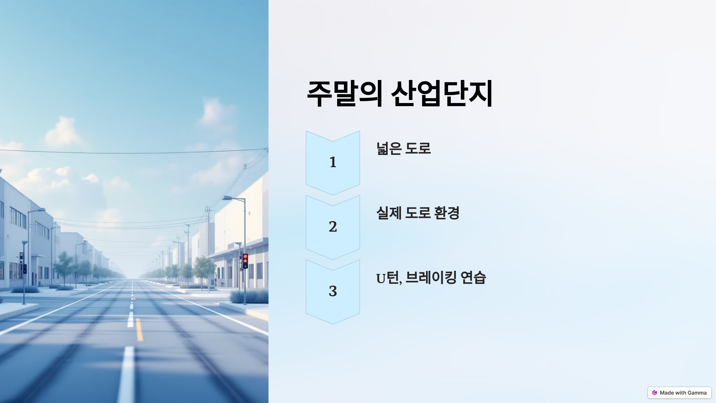 평일에는 차가 많지만 주말에는 텅 비는 산업단지도 초보 라이더들에게 좋은 연습 장소입니다. 도로 폭이 넓고 신호등이 적어 실제 도로 주행 감각을 익히기에 딱이에요!