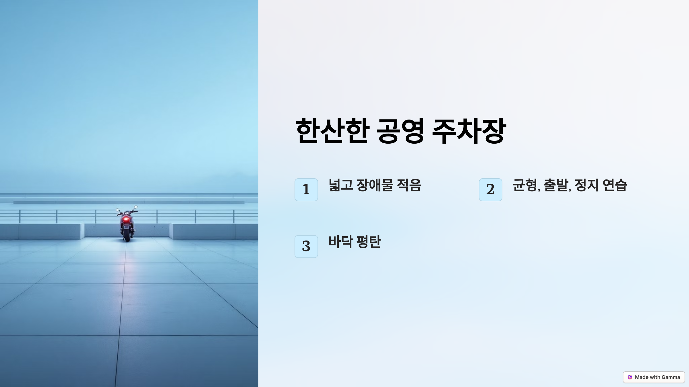 초보 라이더가 오토바이 연습을 하기 가장 좋은 곳 중 하나는 한산한 공영 주차장입니다. 이곳은 넓고 장애물이 적어서 기본적인 균형 잡기, 출발 & 정지, 저속 주행 연습을 하기에 좋아요!